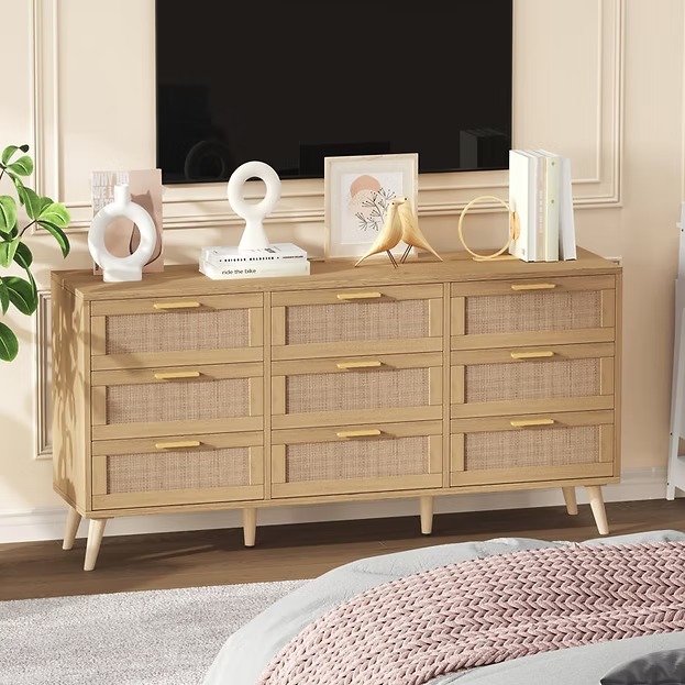 Only for Adults 9 Drawers for Sorting and Storage Large Desktop for books, plants and decorations 9 Drawers with metal tracks for easy opening and closing Rattan style and Golden Handles will add a splash of color to your home Anti-dumping device on the back to ensure the safety.