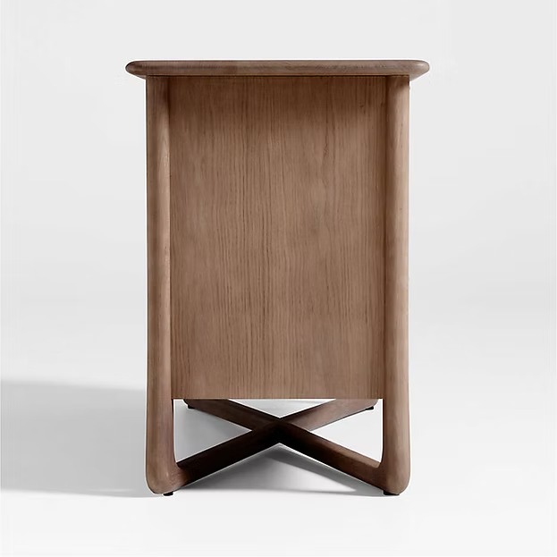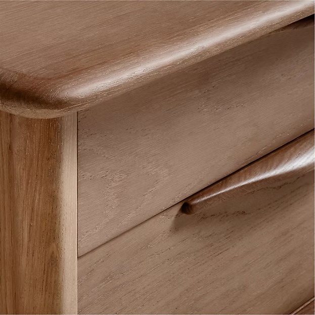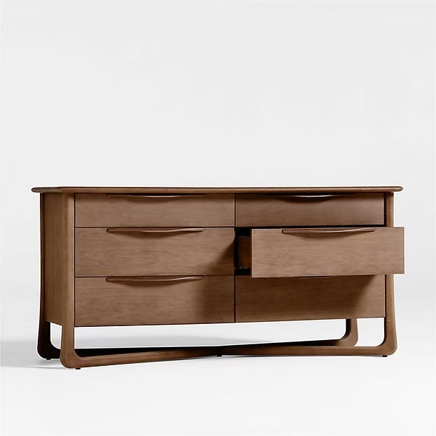 Inspired by mid-century design and the unique look of handcrafted furniture, our Alrik dresser is clean-lined yet rich with eye-catching details. The solid oak frame softens the look with rounded edges and legs that curve to form an X-base. The wood’s beautiful grain is prominently featured in the dresser’s inset side panels and six drawer fronts accented with pulls carved into elongated scallop shapes.