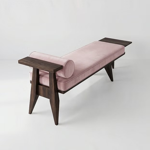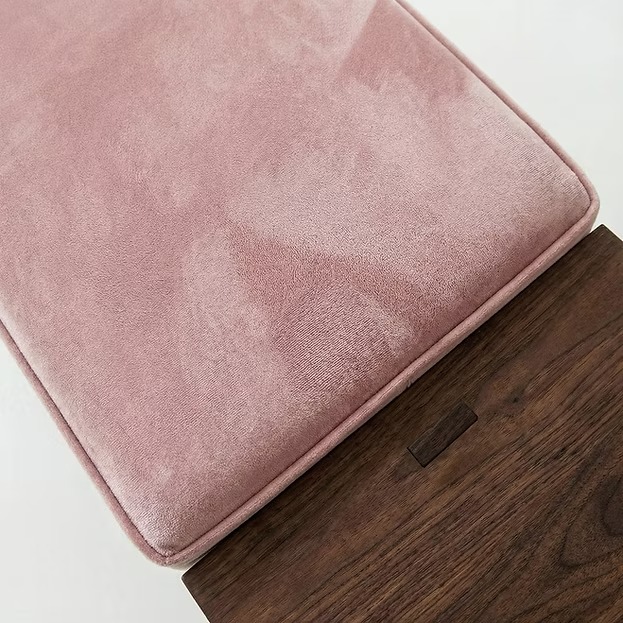 Soft pink velvet brings a gentle warmth to this upholstered walnut bench, while the solid wood frame keeps the look grounded and refined. A natural finish give the woodworking presence you can appreciate up close. Use this bench at the foot of the bed or along a living room wall and the space gets a welcoming landing spot.