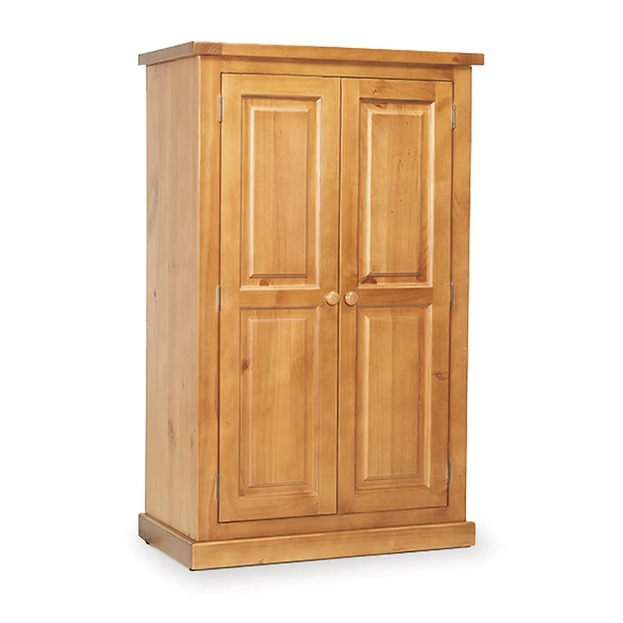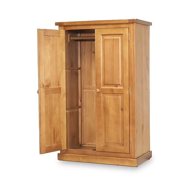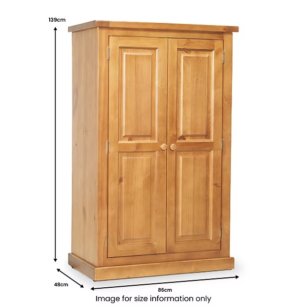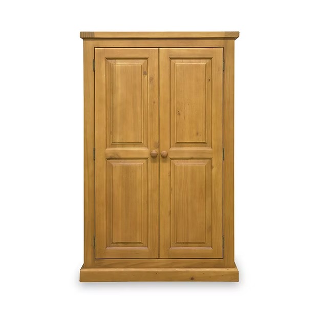 Organise your wardrobe beautifully with this compact country-style wardrobe Hang garments perfectly with full-width wooden hanging rail Store efficiently with generous hanging space in compact footprint Experience chunky quality with thick solid pine construction Add timeless charm with traditional raised panel doors Appreciate lasting beauty with hand waxed finish and rich grain.