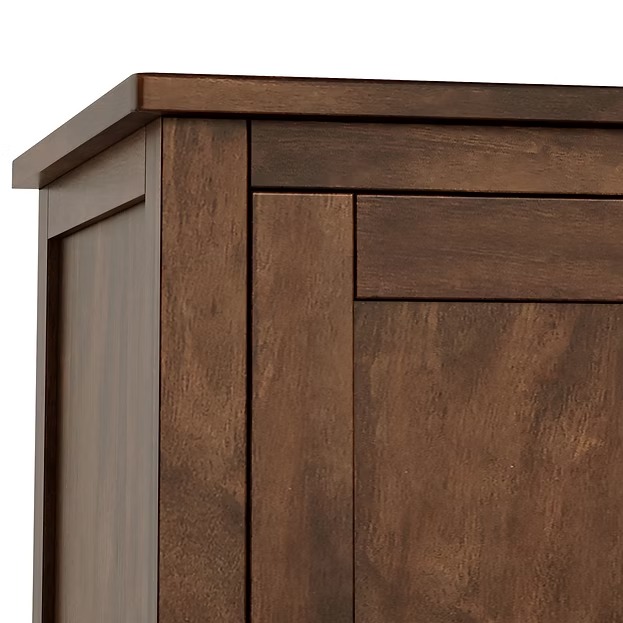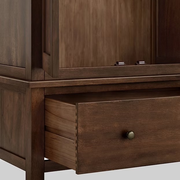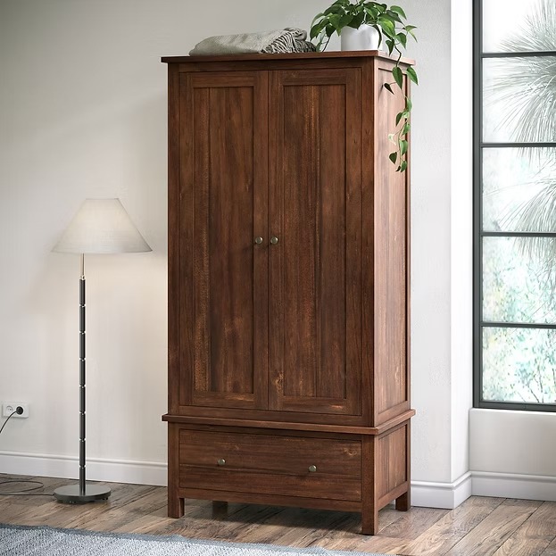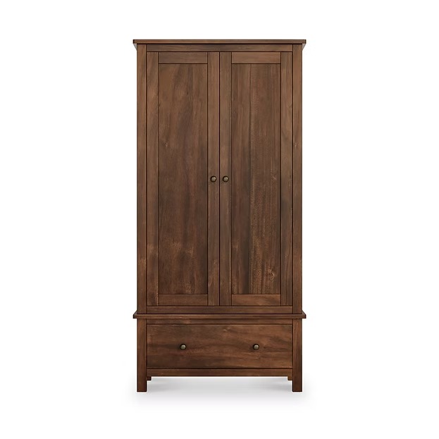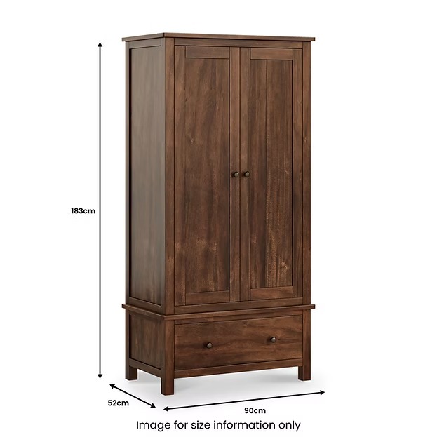 Spacious double wardrobe with ample hanging and storage space Solid Acacia construction ensures durability Elegant lacquered wood grain finish for timeless appeal Large drawer at base for additional organisation options Sturdy dovetail joints ensure drawer longevity Upper hanging rail maximises vertical storage potential Antique brass handles add a touch of rustic elegance